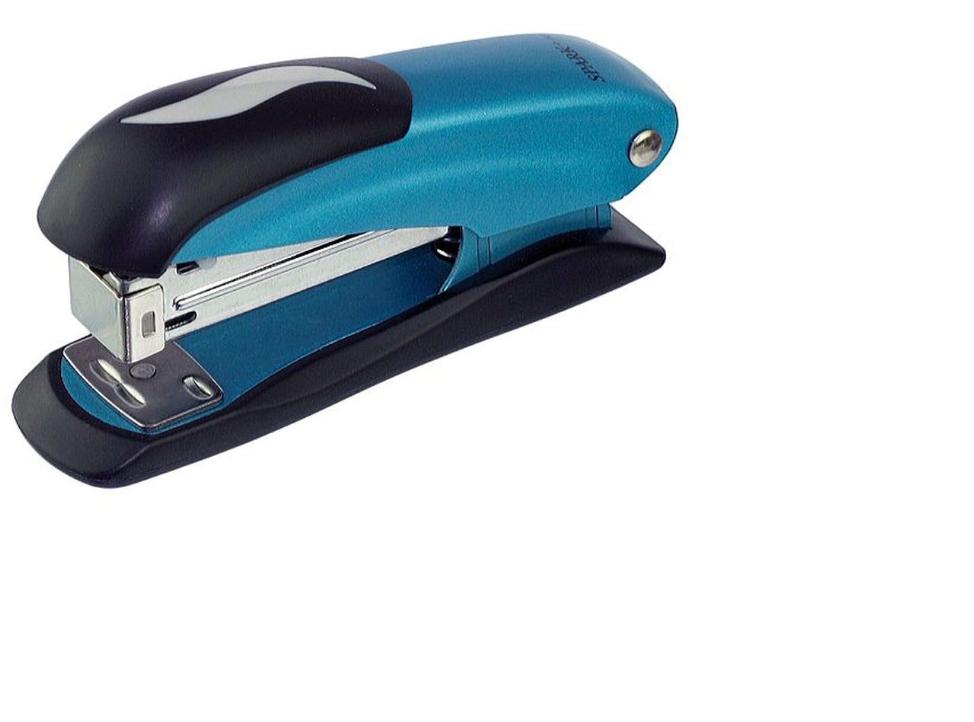 Mały metalowy zszywacz 2461 z przeciwpoślizgową nakładką z miękkiego tworzywa, zszywki 24/6 lub 26/6, zszywa do 20 kartek papieru jednocześnie, zasięg zszywania do 50 mm, kolory: niebieski BLUE METALIC, seria Spark-Line.