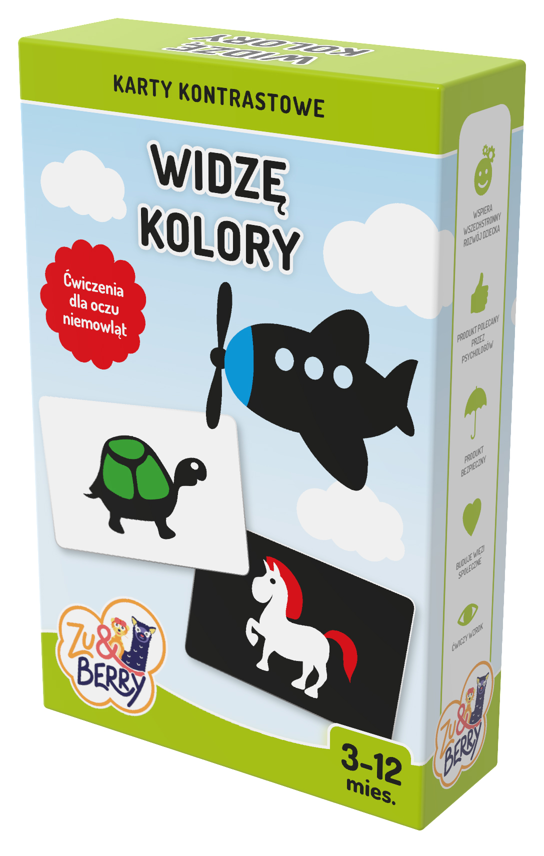 12 dwustronnych kart to 24 ilustracje przeznaczone do twórczej zabawy. Ilustracje wprowadzają dziecko w świat kolorów i nowych doznań sensorycznych. Pomagają również dorosłemu budować wieź emocjonalna z dzieckiem i uczestniczyć w jego rozwoju poznawczym .