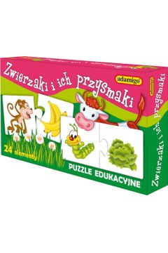 Zestaw zawiera 24 puzzle, z których można ułożyć 12 obrazków przedstawiających zwierzęta i ich przysmaki.